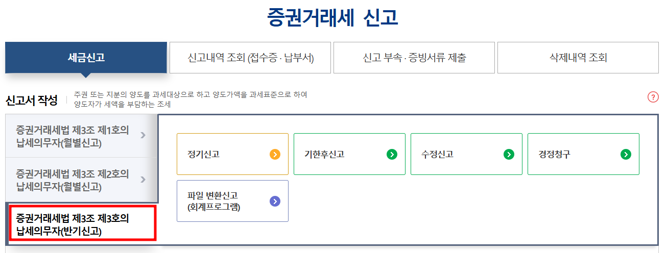 - 증권시장이나 금융투자업자 등이 아닌경우 3조 3호의 납세의무자로써 반기신고를 선택하시면 됩니다.